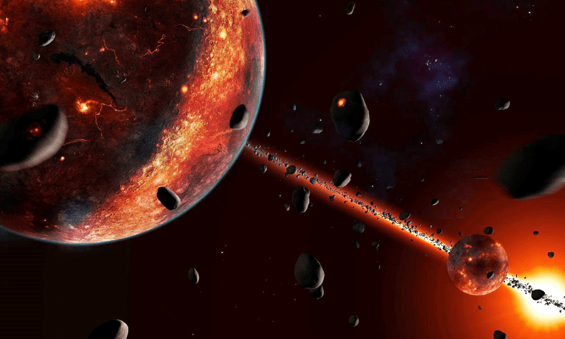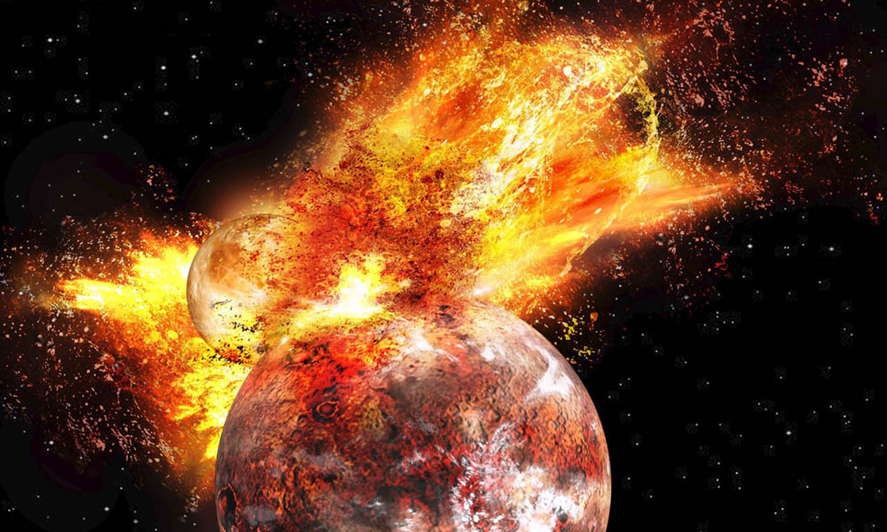 Kuu syntyi todennäköisesti Marsin kokoinen kappaleen, Theian törmätessä Maahan. Tämä oli viimeisin erittäin suuri törmäys. Törmäyksen seurauksena Maan uloimmat osat sulivat täysin ja yli puolet silloisesta planeetastamme muuttui äärimmäisen kuumaksi magmamereksi. Haihtuvat aineet höyrystyivät ja karkasivat maapallolta; ilmakehän vesi ja typpi tulivat Maahan myöhemmin asteroidien ja komeettojen mukana.