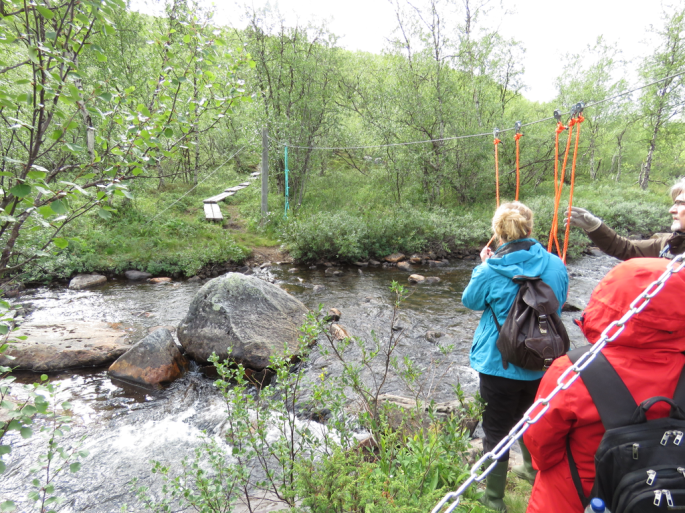 Kirkkotuvilta Maailman historian aikavaellusreitti jatkuu tunturille suuntautuvaa pitkää vaellusreittiä pitkiä. Polku nousee kauniiseen tunturikoivikkoon ja seurailee ensin parin kilometrin verran Badjaseavtettet puroa. Sopivan ylityspaikan kohdalla polku ylittää puron. Ylitystä helpottaa puron yli vedetty ”köysirata”, joska vaeltaja voi ottaa tukea veden läpi kahlatessaan. Matalan veden aikana ylitys sujuu helposti, mutta tulva-aikaan vaeltajan on turvallisempaa lähteä jo maantieltä käsin kulkemaan puron eteläisempää rantaa pitkin.