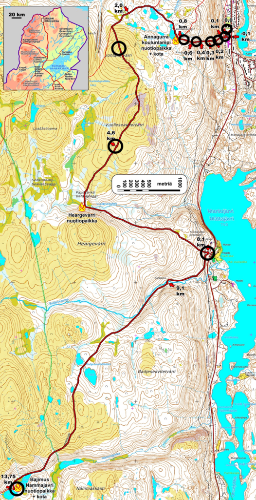 Reittikartta ja sijainti: Vaellusreitin lähtöpiste on Utsjoen keskuskoulun takapihalla