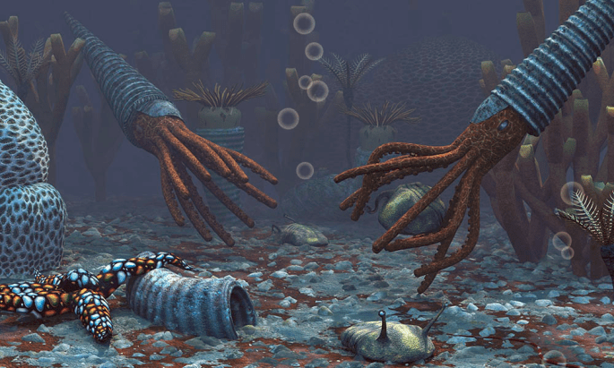Pehmeärakenteiset Ediakaran eläimet ilmestyivät matalien merien pohjalle Gryogenian jääkauden päätyttyä n. 600 milj. vuotta sitten.