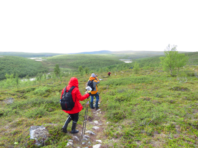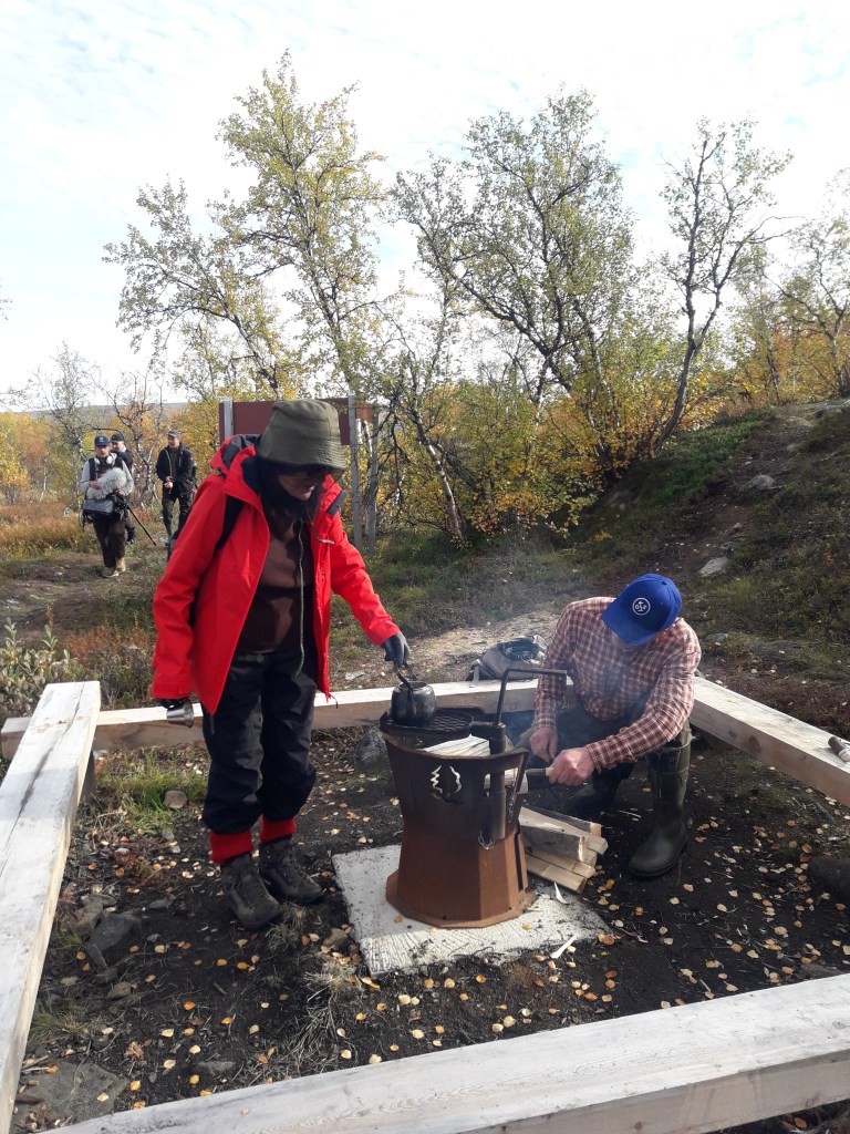 Kuuden kilometrin vaelluksen jälkeen saavumme Härkävaaran nuotiopaikalle. Koordinaatit Galileon linkkisysteemissä (https://www.kyberturvallisuuskeskus.fi/fi/toimintamme/satelliittipaikannus): 69,8600; 26,9523