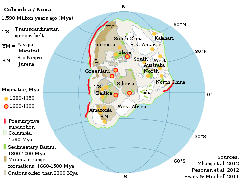Columbia supermantereen varhaisempi vaihe Nena sisälsi osia Pohjois-Amerikkaa, ja Baltika Skandinaviaa ja Itä-Karjalaa. Mantereiden yhdistelmät ja sijainnit ovat aikojen kuluessa moneen kertaan kokonaan muuttuneet.